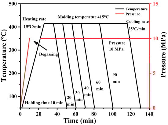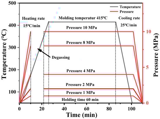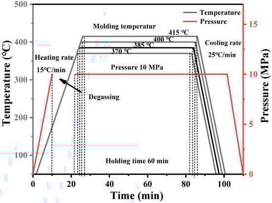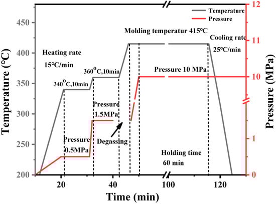 The effect of the pre-compaction process on the composite properties is noteworthy. During the processing of the composite, applying a certain pressure below the molding temperature to pre-compact the resin matrix and reinforcement materials can help discharge gas before the resin melts, thereby reducing the defect of the product. In this work, a pressure of 0.5 MPa was applied at 340 °C for 10 min, then the temperature was increased to 360 °C, and a pressure of 1.5 MPa was applied for 10 min. After pre-pressing, the temperature was increased to 415 °C, and a pressure of 10 MPa was maintained for 60 min. The hot-pressing process is shown in Figure 15.