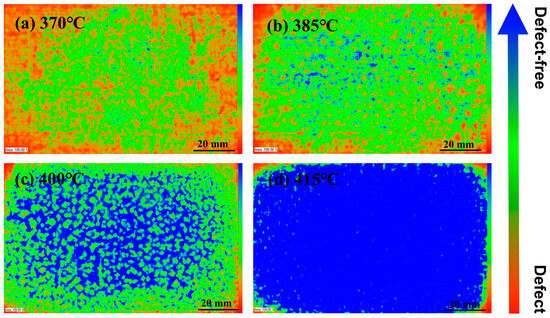 The internal structure of CFF/PEEK composite was investigated using C-mode scanning acoustic microscopy (C-SAM). The blue part in the image represents the fully transmitted part where the ultrasonic wave propagates well, which is the defect-free region. The green part represents the area where the ultrasonic wave propagates poorly, and the red part is usually regarded as defects due to holes caused by insufficient compaction inside the product. As shown in Figure 4a, it can be seen that when the hot-pressing temperature is 370 °C, the composite material has larger holes and defects inside. This is because at lower temperatures, the PEEK resin has high viscosity and poor fluidity, and the molten resin cannot infiltrate into the grooves of the carbon fiber fabric, resulting in inadequate impregnation of the fibers. From Figure 4b–d, as the hot-pressing temperature increases, the blue region gradually increases, and the defect decreases. With the increase in hot-pressing temperature, the resin’s fluidity improves, allowing it to infiltrate into the grooves of the carbon fiber. The increasing hot-pressing temperature can enhance the bonding performance between PEEK resin and carbon fiber fabric, reducing defects inside the composite material.