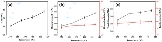 Relationships between mechanical properties and molding temperature of CFF/PEEK composites: (a) ILSS; (b) flexural strength and flexural modulus; and (c) tensile strength and tensile modulus.