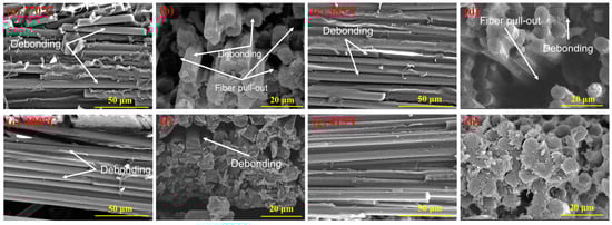 To further reveal the mechanism of the internal influence of molding temperature on the mechanical properties of CFF/PEEK composites, the cross-sectional morphologies (including perpendicular and parallel to the CFF direction) of tensile specimens of CFF/PEEK composites were observed with scanning electron microscopy (Figure 6). When the molding temperatures were 370 °C, 385 °C, and 400 °C (Figure 6a–f), voids caused by fiber pullout and fiber–matrix debonding were observed obviously. This can be attributed to the PEEK matrix having a higher viscosity at lower molding temperatures. The molten PEEK resin does not easily flow between the fibers, resulting in obvious cracks and resin-free areas in the composites, which leads to a poor infiltration level of the resin into the fibers. When the molding temperature rises to 415 °C, the samples show step-like fractures, and the cross-section is uniformly wrapped with PEEK resin (Figure 6g,h). This can be explained by the fact that the viscosity of the resin is lowest at 415 °C, which makes the molten PEEK resin easier to penetrate into the fiber bundles. Meanwhile, due to the good penetration performance of the resin matrix, the gaps between the fiber bundles were reduced. This indicates that the molten resin has successfully penetrated into the carbon fiber bundles and enabled them to have good binding ability to resist the destruction brought by external forces.