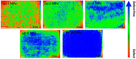Figure 8 shows the C-SAM images of CFF/PEEK composites molded under different pressures. It can be observed from the images that with the increase of hot-pressing pressure, the blue area inside the composite gradually increases, and the defects gradually decrease. Due to its high viscosity, PEEK resin is difficult to flow at low pressure, which makes it impossible to fully infiltrate the carbon fiber fabric, resulting in defects. However, the increasing pressure allows the molten resin to infiltrate the carbon fiber fabric quickly, making the fibers tightly bonded together and reducing defects in the composite.