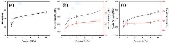 Relationships between mechanical properties and molding pressure of CFF/PEEK composites: (a) ILSS; (b) flexural strength and flexural modulus; and (c) tensile strength and tensile modulus.