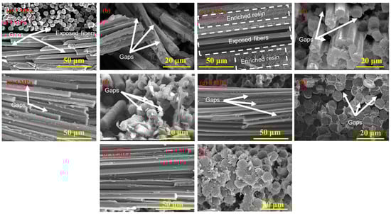 The SEM images of fracture morphology from tensile of CFF/PEEK composites under different forming pressures are depicted in Figure 10. At a molding pressure of 1 MPa, numerous exposed fibers and noticeable gaps can be observed (Figure 10a,b), indicating that insufficient molding pressure fails to facilitate smooth infiltration of PEEK resin into CF bundles. When the molding pressure is 2 MPa, many gaps between fibers, fiber–matrix debonding, and enriched resin areas can be seen clearly (Figure 10c,d). This phenomenon may be attributed to insufficient pressure for complete infiltration into the interior of fiber bundles, resulting in resin accumulation on the surface. As the pressure rises to 4 MPa and 8 MPa (Figure 10e–h), holds within the composite material gradually decrease while achieving a more uniform distribution of resin within fiber bundles. However, some defects and voids still remain. When the molding pressure is 10 MPa, the fracture surface appears relatively flat without fiber pullout or fiber–matrix debonding, as shown in Figure 10i,j. This also means the molten PEEK resin can impregnate the fiber very well.