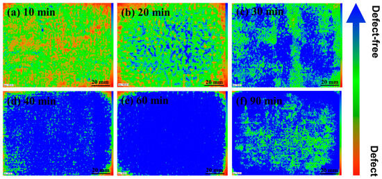 The effect of hot-pressing time on the internal structure of the CFF/PEEK composite is significant. Figure 12 shows the C-SAM images of the composite materials molded under six different hot-pressing times. It can be seen from the images that with the increase of hot-pressing time, the CFF/PEEK composite gradually becomes more compact, and the area of defects significantly decreases. However, when the time increases to 90 min, scattered defects appear in the composite material relatively. This may be owing to the long-term high-temperature and high-pressure conditions causing partial crosslinking of the resin and an increase in viscosity, making it difficult for the CFF to be well impregnated.