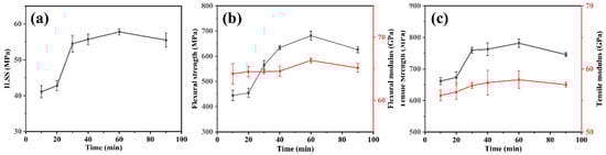 Relationships between mechanical properties and molding time of CFF/PEEK composites: (a) ILSS; (b) flexural strength and flexural modulus; and (c) tensile strength and tensile modulus.