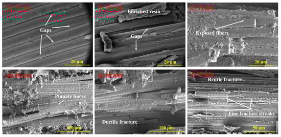 The SEM images in Figure 14 illustrate the fracture surfaces under flexural loading of CFF/PEEK composites fabricated with different molding times. At a molding time of 10 min (Figure 14a), noticeable gaps can be observed between fibers due to insufficient time for PEEK resin infiltration into CFF. As the molding time increased to 20 min and 30 min (Figure 14b,c), the impregnation of the fiber surface improved, but exposed fibers and gaps still persisted. When molding time reaches 40 min, most fibers are covered by resin while feathery burrs appear on their surfaces, exhibiting pinnate burrs in localized areas and indicating plastic deformation and ductile fracture behavior of PEEK resin (Figure 14d). For the case of 60 min holding time, fiber surfaces become more evenly coated with resin while distinct feathery burrs are observed in cross-sections indicating typical plastic fracture mode occurrence, demonstrating good impregnation degree and strong fiber–matrix interface strength. However, as the molding time reached 90 min, fine fracture streaks appeared on the sample’s fracture surface while plastic deformation disappeared (Figure 14e), indicating typical characteristics of brittle fracture. This change in fracturing morphology can be attributed to excessive crosslinking density as a result of prolonged molding time. Optimal molding time ranging from 40–60 min ensure full infiltration of CFF by PEEK resin without excessive crosslinking, promoting a strong bond between fiber and matrix and thereby enhancing mechanical properties of CFF/PEEK composites. However, an excessively prolonged molding time can lead to the excessive crosslinking of PEEK resin, resulting in a transition from toughness to brittleness and even slight thermal degradation. As a consequence, this weakens the fiber–matrix bonding strength and leads to a decrease in mechanical properties.