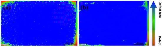 Figure 16a shows a C-SAM image of the composite without the pre-compaction process, and Figure 16b shows a C-SAM image of the composite with the pre-compaction process. It can be clearly seen from the pictures that the defective areas of the composite with pre-compaction have significantly decreased, and the compacted area inside the lamellar has increased, especially at the edges of the composite. This may because of that during the hot-pressing process of composite, pre-compaction softens the PEEK film and allows it to infiltrate into the CFF under a certain pressure. During the degassing stage, it is easier to discharge gas bubbles under a certain pressure. Then, at the hot-pressing temperature, the PEEK film melts, and pressure is increased, making it easier for the melt to fully infiltrate into the CFF, thereby avoiding internal defects such as bubbles and delamination in the composite.
