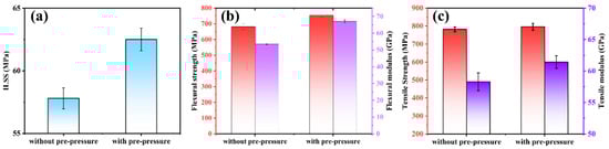 Relationships between mechanical properties and with or without pre-pressure of CFF/PEEK composites: (a) ILSS; (b) flexural strength and flexural modulus; and (c) tensile strength and tensile modulus.