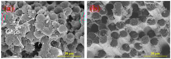 SEM images of typical fracture surfaces of CFF/PEEK composites: (a) without pre-pressure and (b) with pre-pressure.