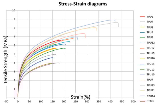 Stress–strain diagrams corresponding to the different TPU presets defined in Table 2.