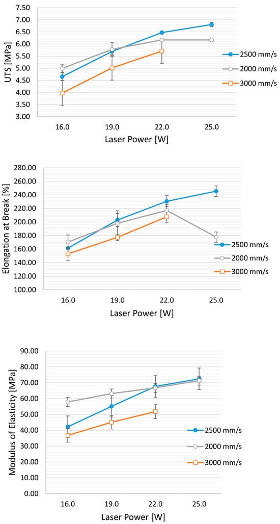 The influence of laser power and laser scan speed on the ultimate tensile strength (UTS) and elastic modulus (E) is depicted in Table 3. An increase in UTS and elastic modulus is observed with a decrease in scanning speed (from 3000 mm/s to 2000 mm/s) and with an increase in laser power (from 12 W to 25 W) (Figure 3). This phenomenon is associated with improved powder coalescence, reducing part porosity.