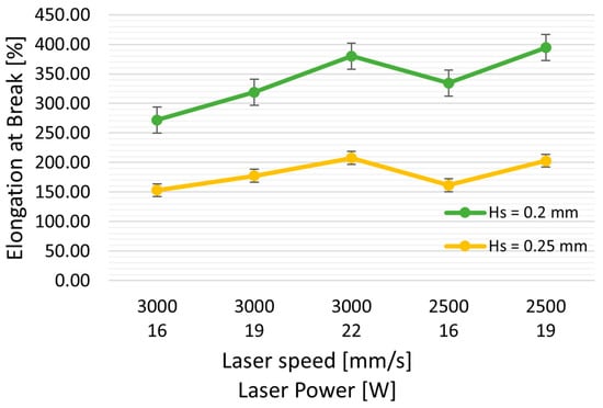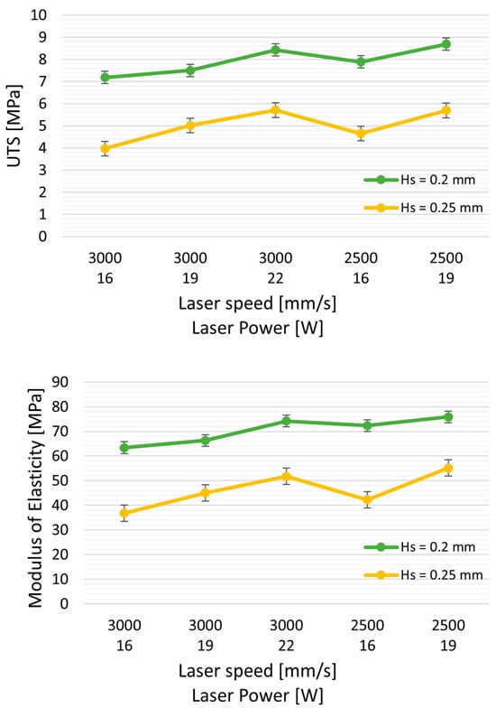Effect of Hs (hatching distance) on mechanical properties: UTS (ultimate tensile strength), elongation at break, and modulus of elasticity. Green curves represent the properties with Hs = 0.20 mm, and yellow curves represent Hs = 0.25 mm, with varying laser powers and at two speeds, 3000 and 2500 mm/s.