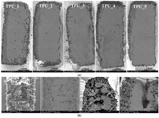 In Figure 5, SEM cross-sectional images depict the microstructure of samples with varying energy densities for both TPUs and TPEs. At a low energy density of 0.21 J/mm3, TPU_1 exhibits higher rugosity (Figure 5a), and similar observations are made for TPE at Ed < 0.34 J/mm3 (Figure 5b, left). Upon increasing Ed to > 0.65 J/mm3, the structure becomes denser. The ‘optimal’ TPE sample (Figure 5b, second from the left) displays a dense center with some peripheral rugosity. However, when Ed exceeds 0.78 J/mm3, the center of the piece degrades due to a rise in local temperature (Figure 5b, right).