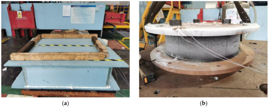 During the experiment, dry ice was continuously supplied without interruption to lower the temperature of the rubber bearing. As shown in Figure 2, the rubber bearing was initially placed in an incubator that was continuously supplied with dry ice. Using the upper and lower cover plates, this configuration facilitated the efficient transfer of low temperatures to the bearing. To adhere to the test standards, it is imperative that the thermocouple reading remain marginally lower than the required test temperature. This adjustment accounted for the rise in temperature caused by the installation technique used for the specimen. It is advisable to maintain this specific temperature range for a period of one to two hours, to allow the rubber bearing sufficient time to attain thermal equilibrium. The sample was then efficiently transferred to the testing apparatus, allowing the compression-shear test to commence immediately.