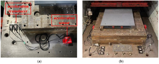 Mounting spherical slide bearing and accelerometers: (a) Installation of accelerometers; (b) Installation of spherical slide bearing.