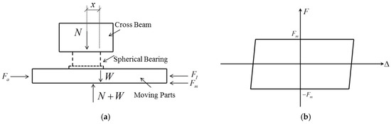 Figure 6a shows a simplified force diagram of the complete loading equipment. The horizontal forces at play consist of the tractive force Fa, which is supplied by the horizontal actuator, the inertial force FI resulting from the motion of the components, and the combined restoring force Fm of the specimen, along with the internal friction within the system. In the vertical plane, the forces present include the reaction force N exerted by the reaction crossbeam, self-weight W of the moving components (including the specimen), and vertical force N + W exerted by the vertical actuator that sustains the moving platform. The combination of the internal friction inside the system and the restoring force exerted by the spherical sliding bearings produced a hysteresis loop, as depicted in Figure 6b. This loop is comparable to a parallelogram enclosed by Coulomb friction. It is important to note that when the specimen was moving horizontally, the first-order derivative of the friction force Fm with respect to deformation was equal to zero.