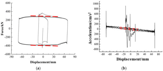 In Figure 7a, the hysteresis loop of the horizontal force exerted by the horizontal actuator is presented as a function of displacement. The red dashed line in the figure serves as a schematic representation for determining ky. Similarly, Figure 7b shows the hysteresis loop of acceleration as a function of displacement. The red dashed line in this figure served as the schematic line for determining kx. To mitigate the influence of changes in displacement direction on data oscillations, the values of kx and ky were determined by sampling data within the range of ±A/2. The mass of the moving component mh can be determined by dividing ky by kx. Once the mass of the moving components has been determined, the inertial force FI can be computed using the data obtained from the accelerometer.