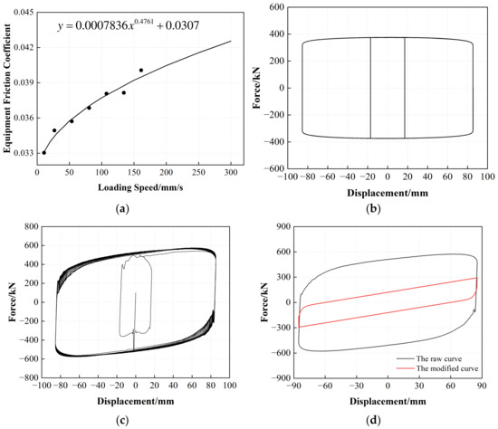 The correction process of the internal friction forces: (a) The correlation curve of the equipment friction coefficient and loading speed; (b) The hysteresis loop of equipment internal friction; (c) The hysteresis curve of LRB900 after deducting inertia force; (d) The shear-displacement hysteresis curves of LRB900.