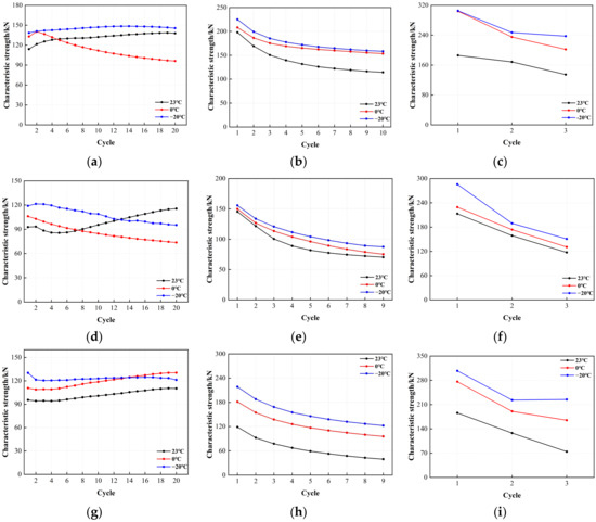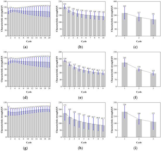 Comparison of the characteristic strength with loading cycles for LRB900: (a) LRB900-1 (0.20 Hz-50%), (b) LRB900-1 (0.20 Hz-100%), (c) LRB900-1 (0.20 Hz-250%), (d) LRB900-2 (0.25 Hz-50%), (e) LRB900-2 (0.25 Hz-100%), (f) LRB900-2 (0.25 Hz-250%), (g) LRB900-3 (0.30 Hz-50%), (h) LRB900-3 (0.30 Hz-100%), and (i) LRB900-3 (0.30 Hz-250%).
