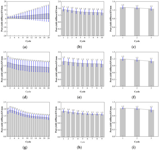 The variation curve of post-yield stiffness and loading cycles for LRB900: (a) LRB900-1 (0.20 Hz-50%), (b) LRB900-1 (0.20 Hz-100%), (c) LRB900-1 (0.20 Hz-250%), (d) LRB900-2 (0.25 Hz-50%), (e) LRB900-2 (0.25 Hz-100%), (f) LRB900-2 (0.25 Hz-250%), (g) LRB900-3 (0.30 Hz-50%), (h) LRB900-3 (0.30 Hz-100%), and (i) LRB900-3 (0.30 Hz-250%).