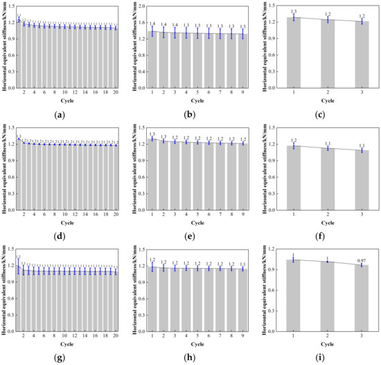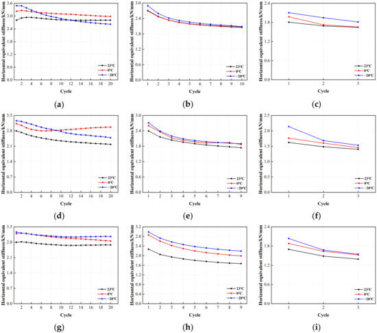 Comparison of the horizontal equivalent stiffness with loading cycles for LNR900: (a) LNR900-1 (0.20 Hz-50%), (b) LNR900-1 (0.20 Hz-100%), (c) LNR900-1 (0.20 Hz-250%), (d) LNR900-2 (0.25 Hz-50%), (e) LNR900-2 (0.25 Hz-100%), (f) LNR900-2 (0.25 Hz-250%), (g) LNR900-3 (0.30 Hz-50%), (h) LNR900-3 (0.30 Hz-100%), and (i) LNR900-3 (0.30 Hz-250%).