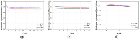 Figure 18 shows the correlation between the horizontal equivalent stiffness of LRB900 and the number of cyclic loading cycles. The horizontal equivalent stiffness of LRB900 varied with the increasing number of loading cycles, similar to its characteristic strength. (1) At 50% shear strain, the horizontal equivalent stiffness of LRB900 decreased from 8% to 19%, regardless of the temperature variations. (2) At shear strains of 100% and 250%, the characteristic strength of the bearing decreased with the increasing number of loading cycles, consequently leading to a reduction in horizontal equivalent stiffness. At a shear strain of 100%, the horizontal equivalent stiffness decreased from 25% to 28%. At a shear strain of 250%, the horizontal equivalent stiffness decreased by 13–20%. In addition, the horizontal equivalent stiffness demonstrated a noticeable temperature dependence under the conditions of 100% and 250% shear strain. Specifically, the horizontal equivalent stiffness increased with decreasing temperature. This behavior can be attributed to the significant increase in the load-carrying capacity of the lead core at lower temperatures.