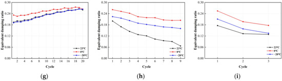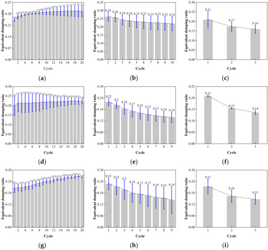 Comparison of the equivalent damping with loading cycles for LRB900: (a) LRB900-1 (0.20 Hz-50%), (b) LRB900-1 (0.20 Hz-100%), (c) LRB900-1 (0.20 Hz-250%), (d) LRB900-2 (0.25 Hz-50%), (e) LRB900-2 (0.25 Hz-100%), (f) LRB900-2 (0.25 Hz-250%), (g) LRB900-3 (0.30 Hz-50%), (h) LRB900-3 (0.30 Hz-100%), and (i) LRB900-3 (0.30 Hz-250%).