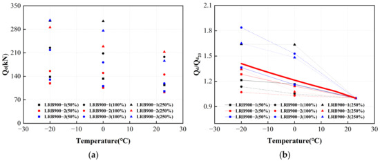 The characteristic strengths of the first hysteresis loops of LRB900 under various loading conditions are shown in Figure 25a. The red line in Figure 25b represents the adjustment coefficient curve after normalization. The characteristic strength of LRB900 increased by 21% at 0 °C compared to that at 23 °C. At a temperature of −20 °C, the characteristic strength of LRB900 increases by 41% compared to 23 °C.