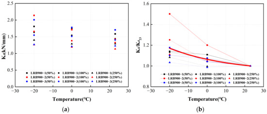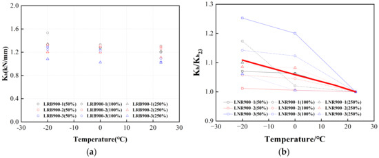 Figure 27a and Figure 28a illustrate the horizontal equivalent stiffnesses of LRB900 and LNR900 during the initial cycle, considering various loading situations. The red lines in Figure 27b and Figure 28b represent the adjustment coefficient curves. In contrast to the ambient temperature of 23 °C, the horizontal equivalent stiffness of LRB900 and LNR900 increased by 11% and 6%, respectively, when subjected to an ambient temperature of 0 °C. At a temperature of −20 °C, there was an increase of 20% and 11% for the corresponding variables.