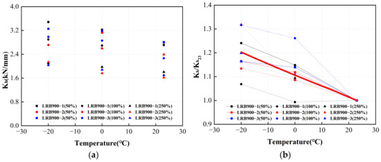 Figure 26a shows the post-yield stiffness of LRB900 during the initial loading cycle under varying conditions. The red line in Figure 26b represents the adjustment coefficient curve. At an ambient temperature of 0 °C, it can be seen that the post-yield stiffness of LRB900 is 6% higher than that at 23 °C. At an ambient temperature of −20 °C, the post-yield stiffness of LRB900 exhibits a 17% increase compared to the stiffness observed at 23 °C.