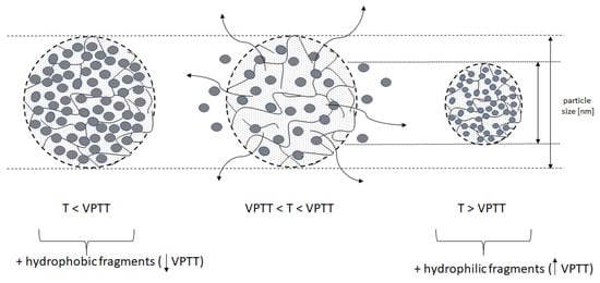 The ability to modify the VPTT is essential for the application of sensitive polymers []. The VPTT can be modified by controlling the substrate composition and reaction conditions, resulting in a structural modification of the polymer [,]. The value of VPTT depends on the content of hydrophilic and hydrophobic moieties in the particle and on their distribution []. It also depends on the type and concentration of the cross-linking agent used as a comonomer in the polymerization process. Incorporation of hydrophilic fragments into the polymer chain increases the VPTT, while incorporation of hydrophobic fragments reduces this temperature [,]. A diagram illustrating the effect on VPTT is shown in Figure 2.