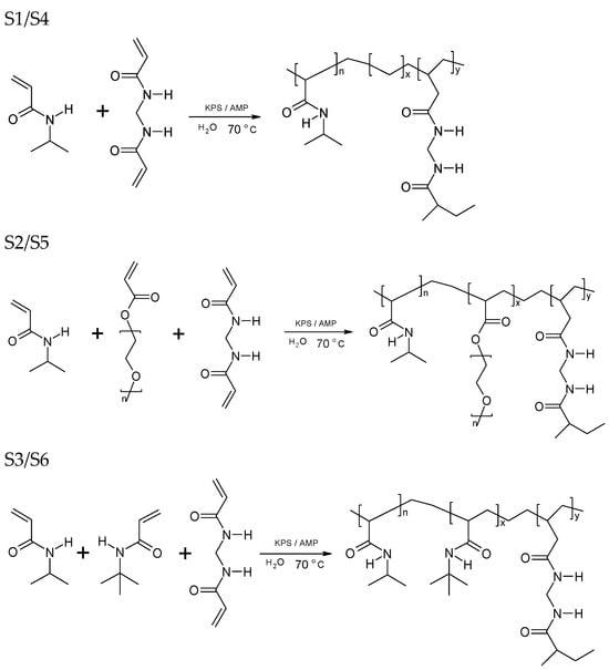 N-isopropyl acrylamide (NIPA, 97%, Sigma Aldrich, Sternheim, Germany), potassium persulfate (KPS, 98%, Sigma Aldrich, Sternheim, Germany), dihydrochloride 2,2′-azobis (2-methyl propionamidine) (AMP, granules, 97%, Sigma Aldrich, Sternheim, Germany), N,N-methylene bisacrylamide (MBA, 99%, Sigma Aldrich, Sternheim, Germany), poly(ethylene glycol) methyl ether acrylate (PEG-MA, 99%, average Mn 500, Sigma Aldrich, Sternheim, Germany), and N-tertbutyl acrylamide (NTB, 99%, Acros Organics, Geel, Belgium) were obtained from industrial and commercial sources and were used without further purification. The dialysis bag with a molecular mass cut-off MWCO 12,000–14,000 Da was obtained from Visking Medicell International Ltd. (London, UK). Deionised water was obtained from an ionic column and conformed to the European Pharmacopoeia monograph on purified water.