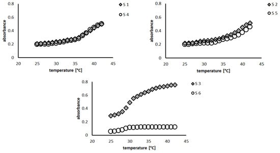 Absorbance variability in the temperature range 25–42 °C. Each chart represents two polymers with the same composition but with different initiators used during the synthesis.
