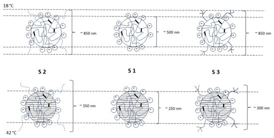The results of DH at 18 and 42 °C are presented in Table 3. The DH at 18 °C of the particles obtained by SFPP with the anionic initiator ranged from 525.00 nm to 859.40 nm. However, when the cationic initiator was used, the DH was characterized by varied values ranging from 312.00 nm to 917.27 nm. At temperatures above the VPTT of 42 °C, a DH range of 100.70 nm–413.20 nm was observed. However, the value of DH was significantly lower after the system was heated. The VPTT of each particle is shown in Table 3 and in Figure 4. The lowest value of 26 °C was observed for particle S6.