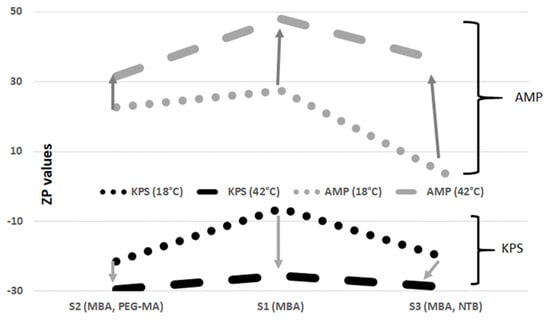 At temperatures below VPTT, the particles can be considered less stable due to their lower ZP values. However, at low temperatures, they form a hydrated colloidal system. At temperatures above VPTT, local dehydration occurs and the surface charge of the molecule is responsible for the stability of the colloidal system. Therefore, the ZP results measured at 42 °C are more valuable for practical purposes. It was observed that in the presence of the MBA cross-linker and AMP initiator alone, the particles produced higher ZP values than particles with MBA and other comonomers. The MBA crosslinker may restrict the movement of the polymer chains, bringing them closer together. The reason for this result is unclear, but Fuciños C. et al. attribute it to the effect of soft particle elasticity on permeability. They claim that a material with a small dielectric constant is negatively charged because there is an electric potential between two materials with different permeabilities []. The cores in the PNIPA-co-MBA spheres synthesized in our group are of similar size, while the additive comonomers hinder particle mobility due to increased high DH via longer, branched functionals. At higher temperatures, the particle diameter decreases and the macromolecule moves faster, resulting in higher ZP values.