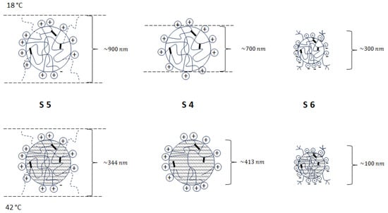 The ZP is proportional to the charge of the particle and inversely proportional to the surface area of the particle. It can be assumed that as the temperature increases, the charge does not change significantly while the surface area of the particle decreases. Therefore, the resulting ZP can increase with increasing temperature, not only because of the increased thermodynamic activity of the solvated molecules, but also because of the decreased internal friction. The decrease in internal friction results from the decrease in particle size. ZP is generated by the core of the sphere itself, with no protruding chains of additional comonomers in the molecule. The ZP charge is calculated per sphere area, with larger spheres having a lower potential and smaller spheres having a higher potential. The change in ZP is due to a change in the DH core of the sphere. Schematic structures with surface charge deposition and DH of synthesized particles S4–S6 are shown in Figure 7.