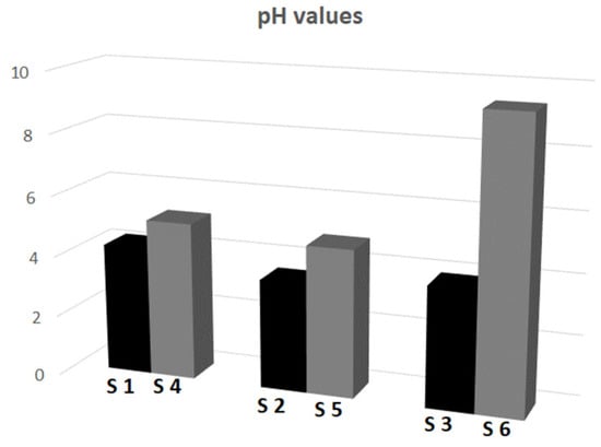The variability of the pH values of particles S1–S6 at 18 °C, polymers synthesized with the anionic initiator (black columns, left in pair), and polymers synthesized with the cationic initiator (grey columns, right in pair).
