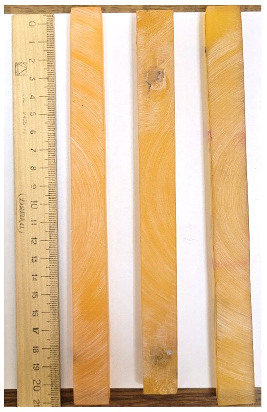 We used a Stegler DG-360 mechanical dispersant-homogenizer to mix the binders. It had a 17 mm diameter M-shaped nozzle, which rotated at a speed of 6000 rpm/min. After mixing, the binders were poured into silicone molds and placed in a laboratory oven for curing. The plate samples were precured at 110 °C for 30 min. After initial curing, the rod samples were cut out of the plate and held at 150 °C for 12 h. After curing, the surface of the specimens was further smoothed using an emery wheel. A photo of the specimens is shown in Figure 1.
