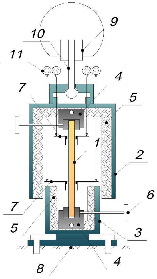 The Tinius Olsen h100ku machine has a load accuracy of ±0.5% for forces ranging from 0.2% to 100% of the installed force sensor, which has a capacity of 100 kN. The resolution of measuring the crosshead movement was 0.1 mm, with an error of up to 0.01 mm. The scheme of the fabricated thermal chamber is shown in Figure 2. The scheme shows a rod sample 1 clamped in internal clamps 4. The thermal chamber consists of an upper movable part 2 and a lower fixed part 3, rigidly bolted to the fixed base 8 of the Tinius testing machine. The upper part 2 of the thermal chamber is in a suspended state. It is clamped in the upper clamp of the Tinius testing machine by a hinged rod 10. The upper 2 and lower 3 parts are not in contact, which allows for the free deformation of specimen 1 clamped in the inner clamps 4. Crimped angle supports 7 are installed on specimen 1 to hold displacement indicators. This will allow for measuring deformations of the specimen at a fixed length (base) and excluding the influence of slipping in the grips.