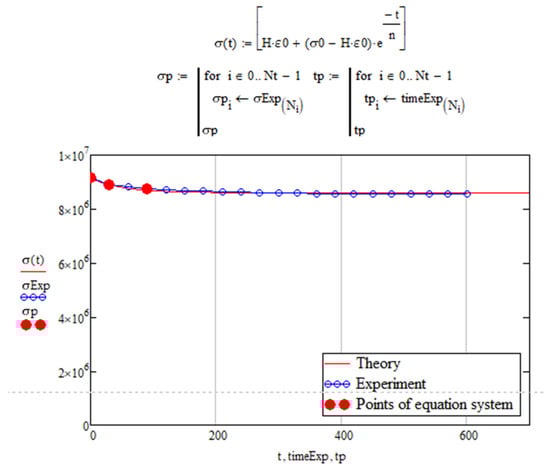 The problem of determining the mechanical parameters for the Kelvin–Voigt model was solved in the Mathcad package. Arrays of stress values and the time to which these stresses correspond were entered into the package. We initially set the values for the required parameters E2 and η (knowing E1). Then, we used numerical methods to solve the system of exponential equations and determine the final values for E2 and η.