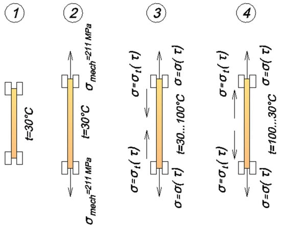 The chosen test scheme involves pre-stretching the specimen using a mechanical load. This keeps the specimen under stress while it is heated, preventing errors caused by backlashes in the testing equipment. Additionally, this scheme allows for evaluating the accuracy of the proposed methodology in a complex stressed state, where both tensile stresses and temperature stresses are relaxing and changing signs.