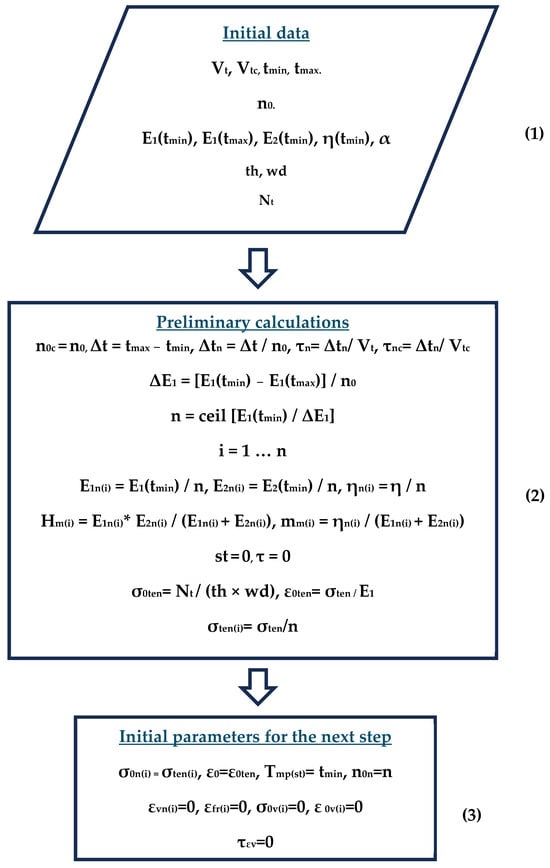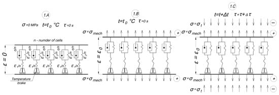 The mechanical properties of plastics are influenced by temperature changes, leading to a specific alteration in the stress state of the constrained element. This phenomenon has been observed experimentally [,,] and is characterized by the accumulation of residual stresses, which can be visually represented as a network of cracks in the polymer matrix. Thermal deformations lead to the development of internal stresses. These stresses develop and build up due to the combined effects of creep and relaxation processes. Furthermore, the rate of these processes varies depending on temperature and the level of applied load. Residual stresses can occur during fabrication and continue to change over the lifespan of a structure. Take, for instance, polymer composite structures like chimneys and gas ducts, which may encounter repeated heating and cooling cycles. In these cases, residual stresses can accumulate within individual elements [,,,].