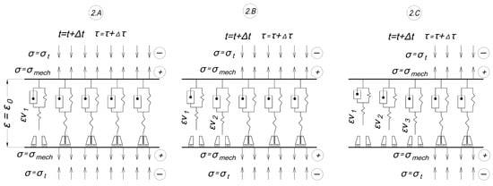 - Using the proposed multi-element model, but the virtual deformations in the disconnected cells were developed without considering inverse creep (i.e., fully elastic): .