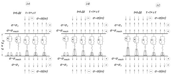 The theoretical approach described below and the proposed structural model are based on the use of a three-element viscoelastic material structural model (Figure 3), known in the literature as the Kelvin–Voigt model [].