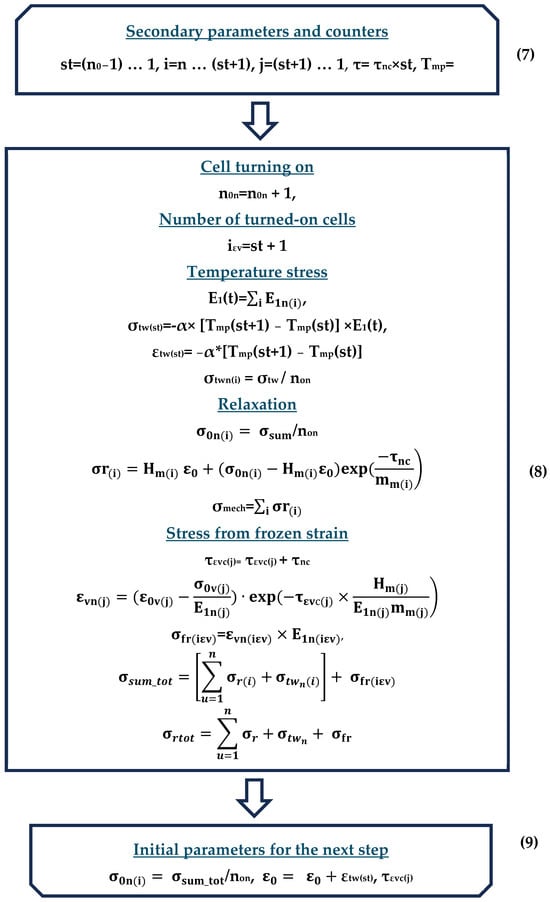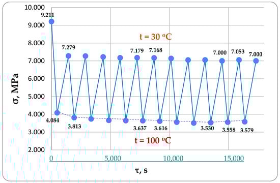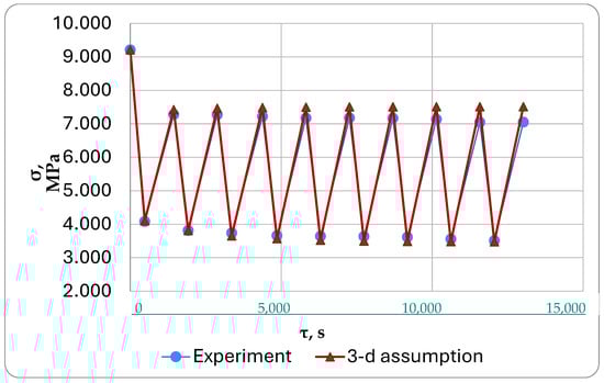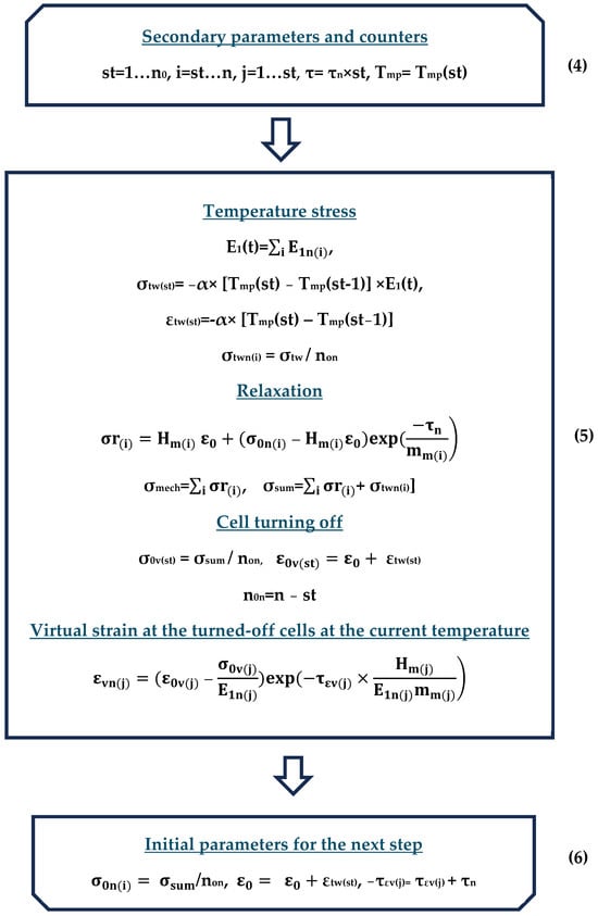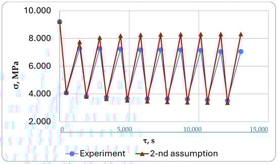 In the first formulation, the theoretical stresses after cooling cycles differed significantly from the experimental ones shown in (Figure 16). After the cooling cycles, the stresses in this formulation were found to be 18…20% lower than the calculated stresses based on the experimental results. This happens because the formulation does not account for the stresses in the turned-off cells caused by reverse creep. In our proposed approach, these stresses are subtracted during cooling, reducing the relaxed mechanical and thermal stresses.