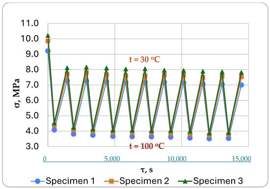 - Once the load of 1800 N was reached, the specimen’s heating mode was activated, raising its temperature to 100 °C in 8 min, achieving a heating rate of 0.1459 °C/s. As the specimen expanded under this heat, the rigid clamping caused compressive thermal stresses to build up, superimposing and reducing the tensile mechanical stresses, as shown by the stress–time curve.
