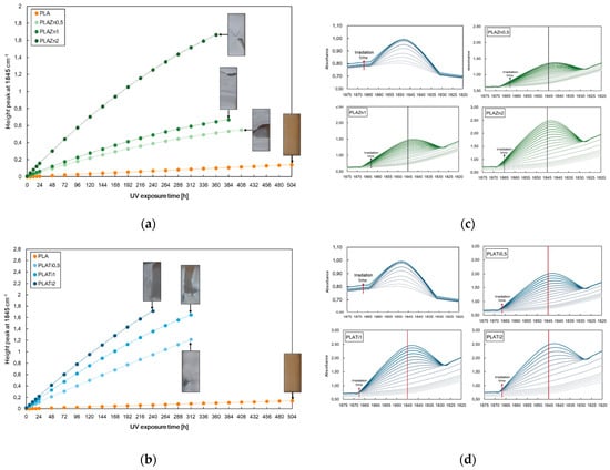 According to the literature, the photo-oxidation of PLA is a complex phenomenon that occurs in forming anhydride functions that are detectable as shoulder-to-peak arising at 1845 cm−1. Further, the photo-oxidation behaviour of PLA-based nanocomposites can also be profitably monitored considering the changes in the same peak at 1845 cm−1 [,]. Considering these notions, the changes in the peak heights at 1845 cm−1 are followed for neat PLA and PLA containing different amounts of metal oxides; see Figure 2.