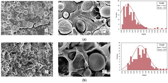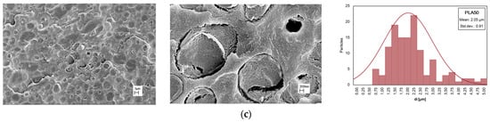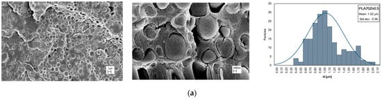 SEM micrographs of PLA/PA11 blends at various magnifications, different compositions, and distribution of PA11 particle dimensions are presented in Figure 4. Drop-matrix morphologies are obtained: the continuous phase is PLA, and the roughly spherical dispersed phase represents PA11. Even supposing PLA/PA11 miscible theoretical solubility, mainly related to the respective low and high polarity, the presence of voids at the PLA/PA11 interface can be noted, so the interface region could be the weakest point in the blend in which failure leading to fracture occurs. Also, according to the literature, the morphology of PLA/PA11, without adding nanoparticles and/or compatible agents, appears poor and the two biopolymer phases are distinguished.