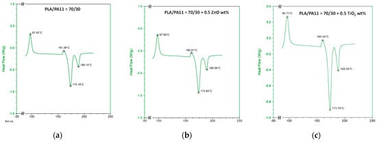 DSC trace of (a) PLA/PA11 (70/30%wt/wt) blend and PLA/PA11 blends containing (b) ZnO and (c) TiO2 at 0.5%wt.