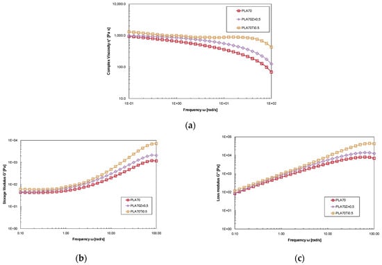 Rheological tests were performed using a stress-controlled rheometer (ARES G-2) in parallel plate geometry (plate diameter 25 mm). The complex viscosity (η*), storage (G′), and loss (G″) moduli were measured under frequency scans from ω = 10−1 to 100 rad/s at T = 170 °C. The strain amplitude was γ = 5%, which preliminary strain sweep experiments proved to be low enough to be in the linear viscoelastic regime.